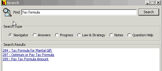 You may want to search through the Title from time to time. The search feature allows you to search the Navigator, Answers, Law & Strategy, Notes, Question Help, and the Text that appears in the Progress window by selecting Search on the Lawgic menu and then Search again.