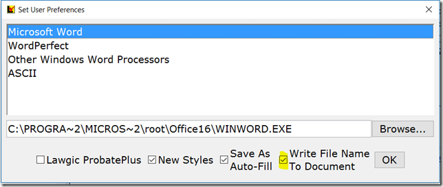 You can now send a single page at the end of our document containing the name of the answer file used to generate the document. It is not anticipated that this would be provided to the client, but it can help find the client’s base answer file when preparing additional documents. To activate this option for your documents, go to the Preferences dialog box, and check the new option to Write File Name to Document.