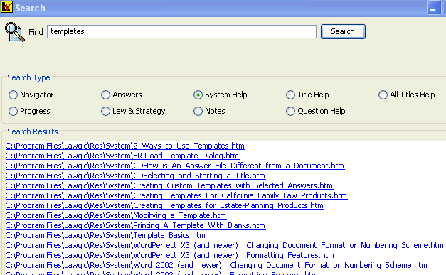 The search feature has been expanded. In addition to searching the Navigator, Answers, Law & Strategy, Notes, Question Help, and Progress for a specific Title, it now allows you to search System Help, Title Help (Resources) and All Titles Help (Resources) by selecting Search on the Lawgic menu. This new function will help to facilitate and expedite your searches.